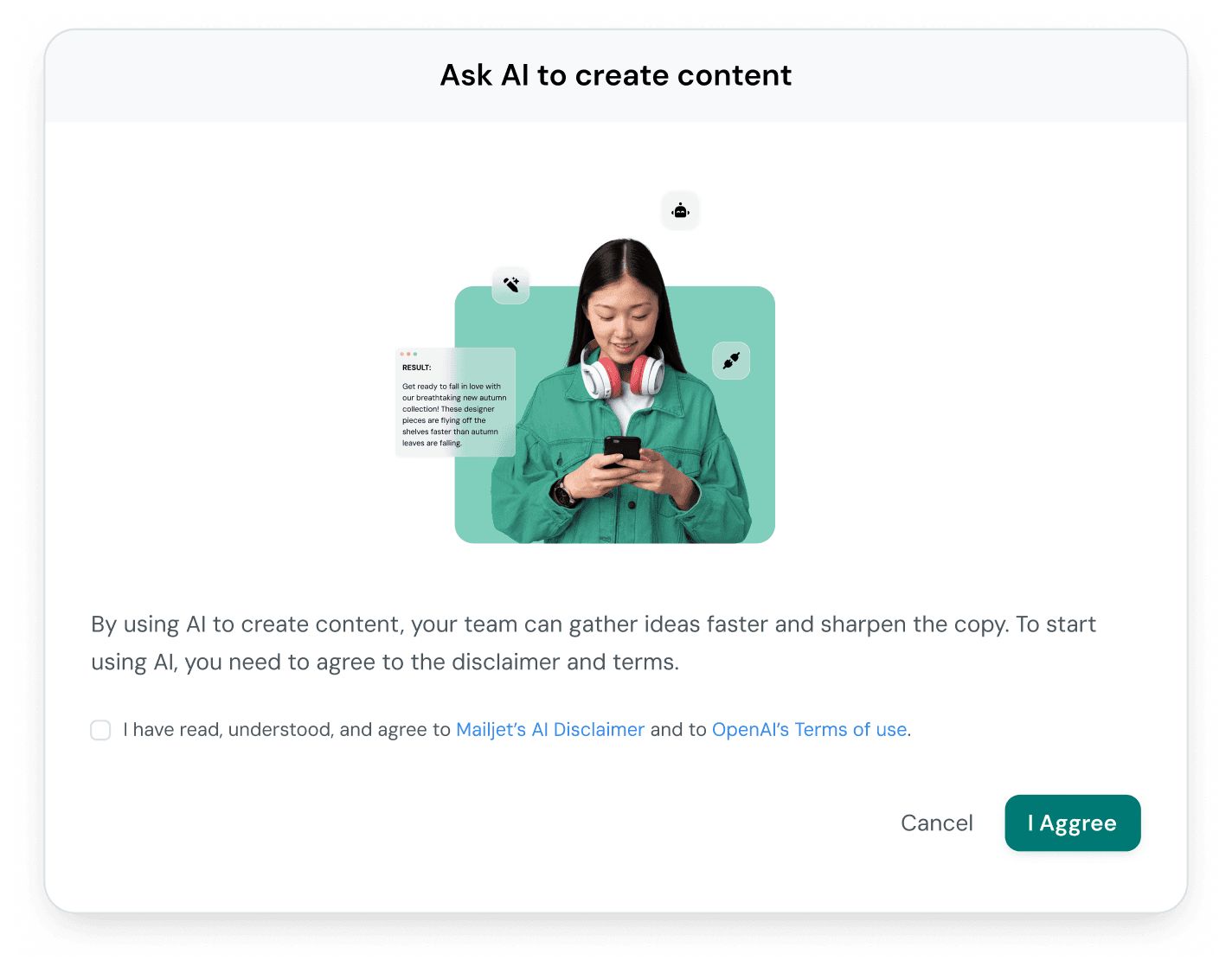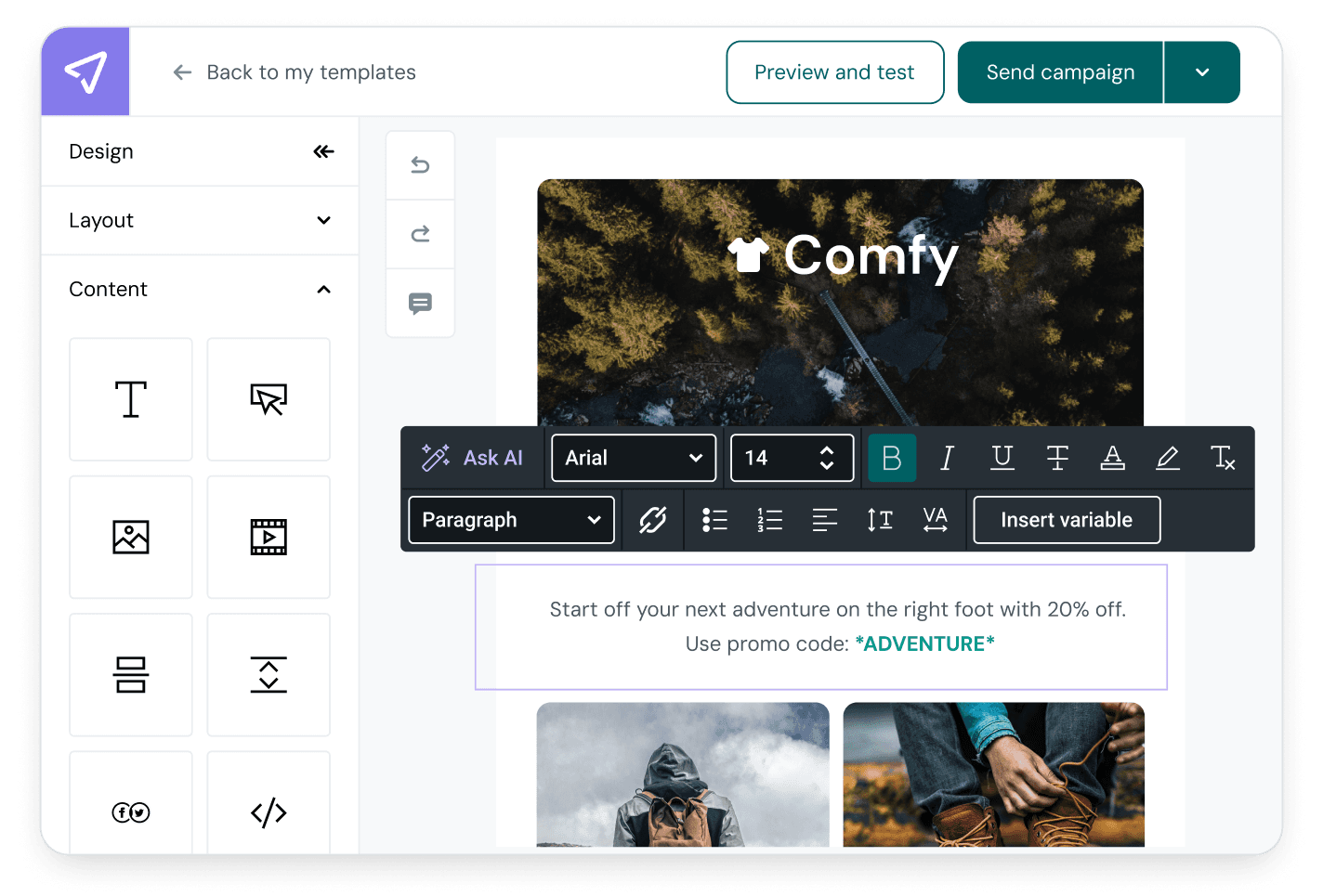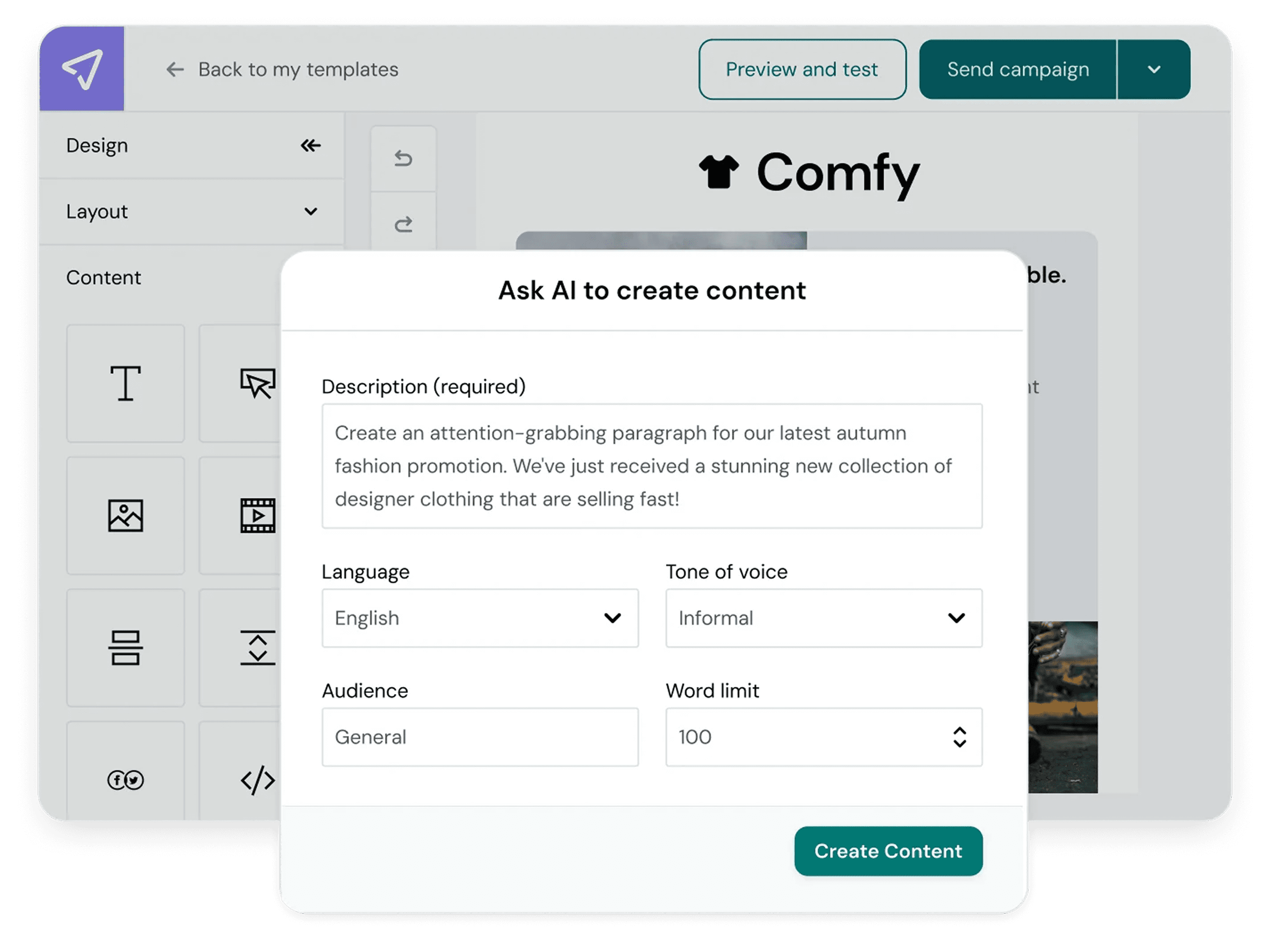 The generated draft landed directly in the email editor, fully editable. No copy-paste, no conversion step, no “export to editor”. Every element — headline, body copy, image, layout block — was immediately selectable and changeable. The mental model we aimed for: “This is a really good first draft from someone who knows my brand.”