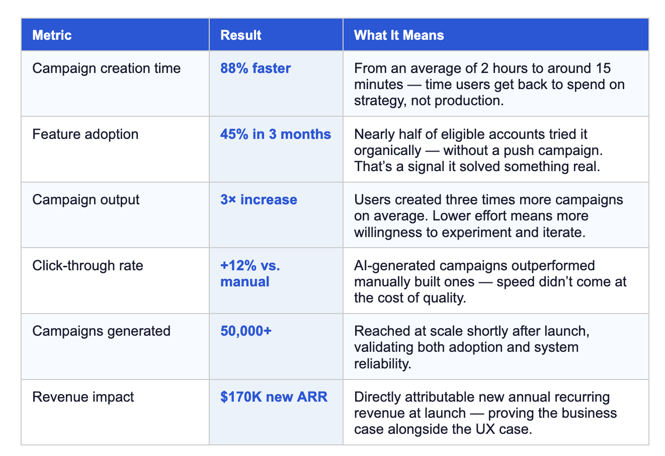 For the business, the adoption numbers, the CTR improvement, and $170K in new ARR at launch made a strong argument for AI investment in the platform — not as a headline feature, but as a quiet accelerant woven into the parts of the workflow where users were most likely to give up.