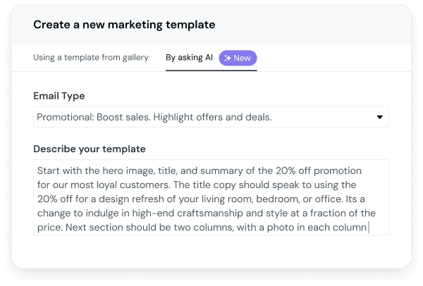The AI Template Generator lets users describe their campaign in plain language — “a Black Friday sale announcement for a new line of winter coats” — and receive a complete, editable email draft in minutes. Structure, copy, imagery, and layout are all generated. Brand styles are applied automatically from the user’s Brand Kit. Nothing is locked.