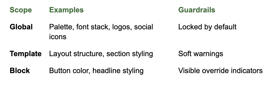 Defined the governance model for global vs. local brand behavior, with clear inheritance and override rules that made system state visible and predictable