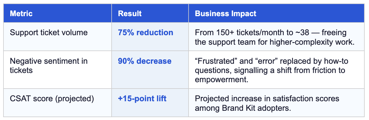 Brand-related support tickets dropped 75%. Negative user sentiment fell 90%. A 15-point CSAT lift is projected among Brand Kit adopters. All of it came from one reframe: stop treating brand as something users configure, and start treating it as the context they build within.